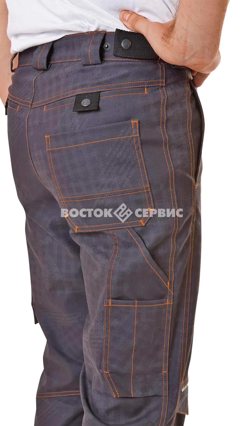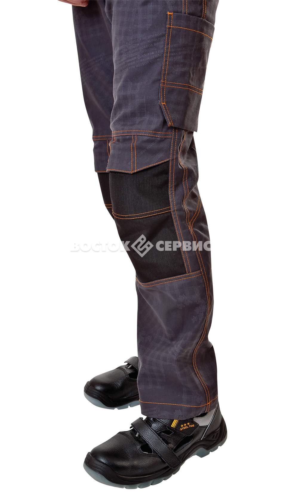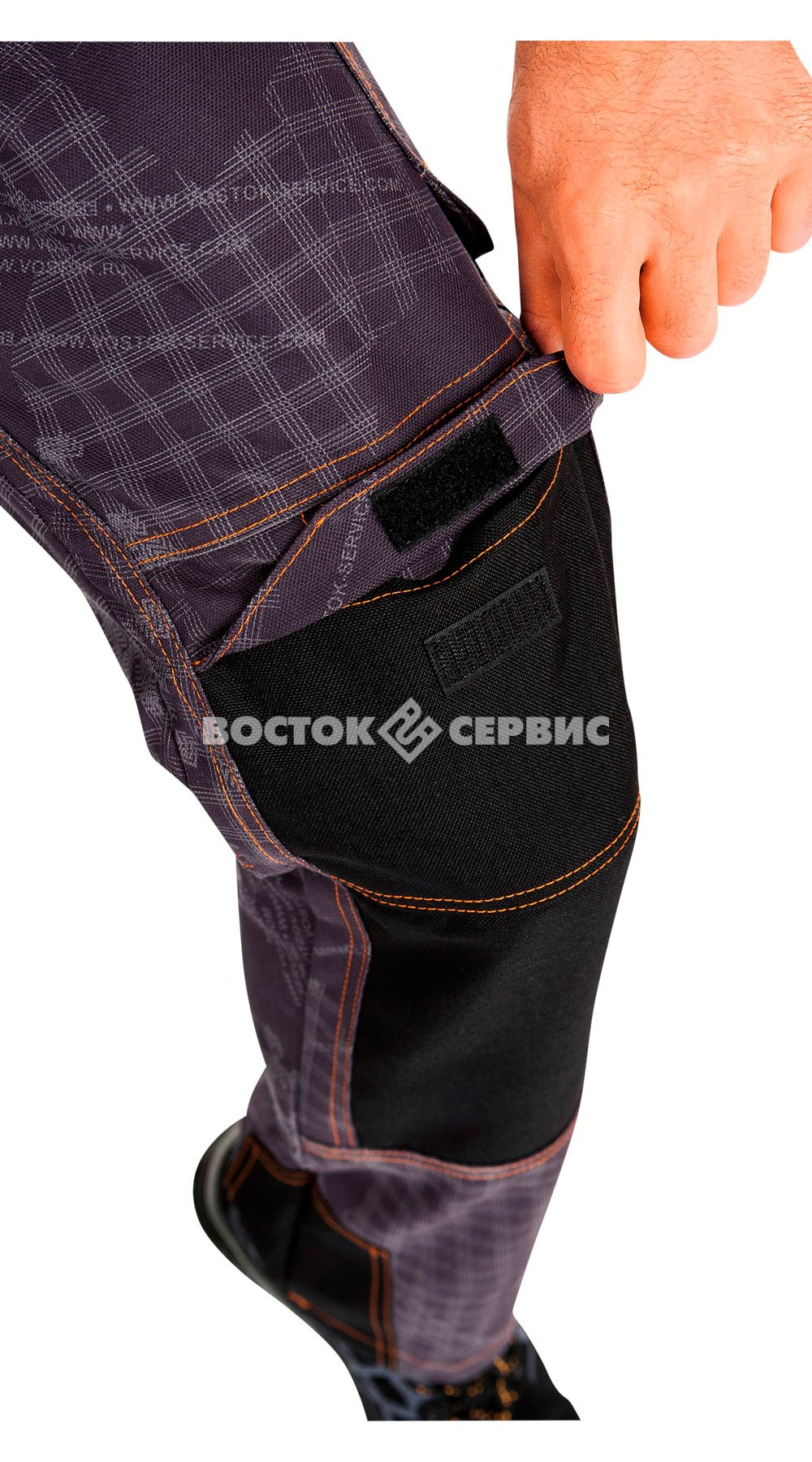 Усилительные накладки: в области коленей со входом для амортизационных вкладышей, по низу шаговых швов