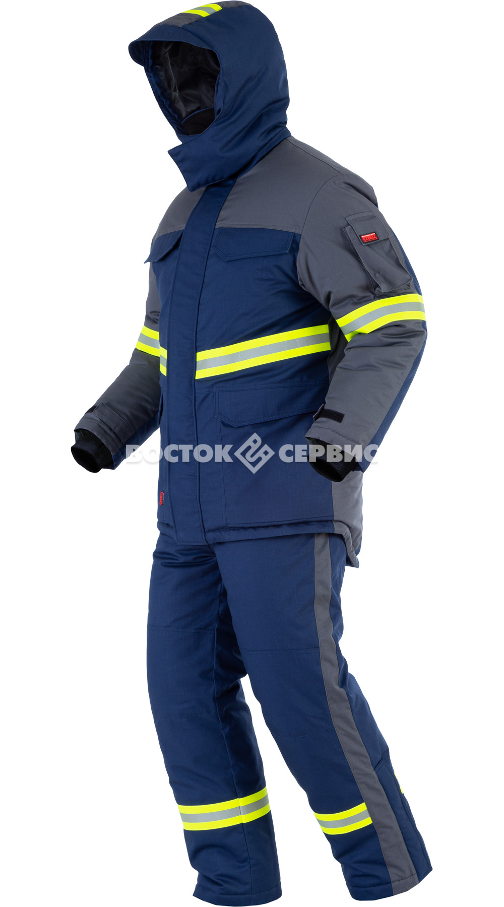 Регулировки по ширине: по низу рукавов, куртки, поясу полукомбинезона Карманы: нагрудные с прямым входом, нижние накладные объемные, на рукаве, внутренние на молнии и накладной объемный; боковые наклонные на полукомбинезоне.
