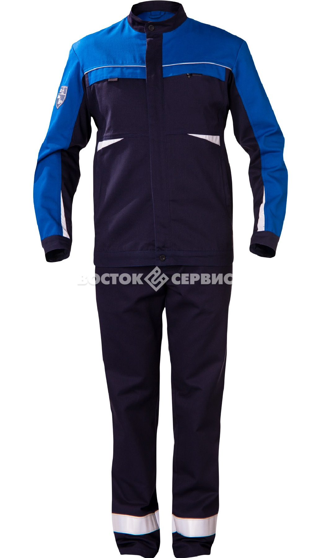 Регулировки по ширине: хлястики на поясе куртки и манжеты на пуговицах; Карманы: нагрудные с клапанами с текстильной застежкой, съемный пластиковый для пропуска, нижние наклонные в шве на молнии; Вентиляционные отверстия: сетка в области пройм
