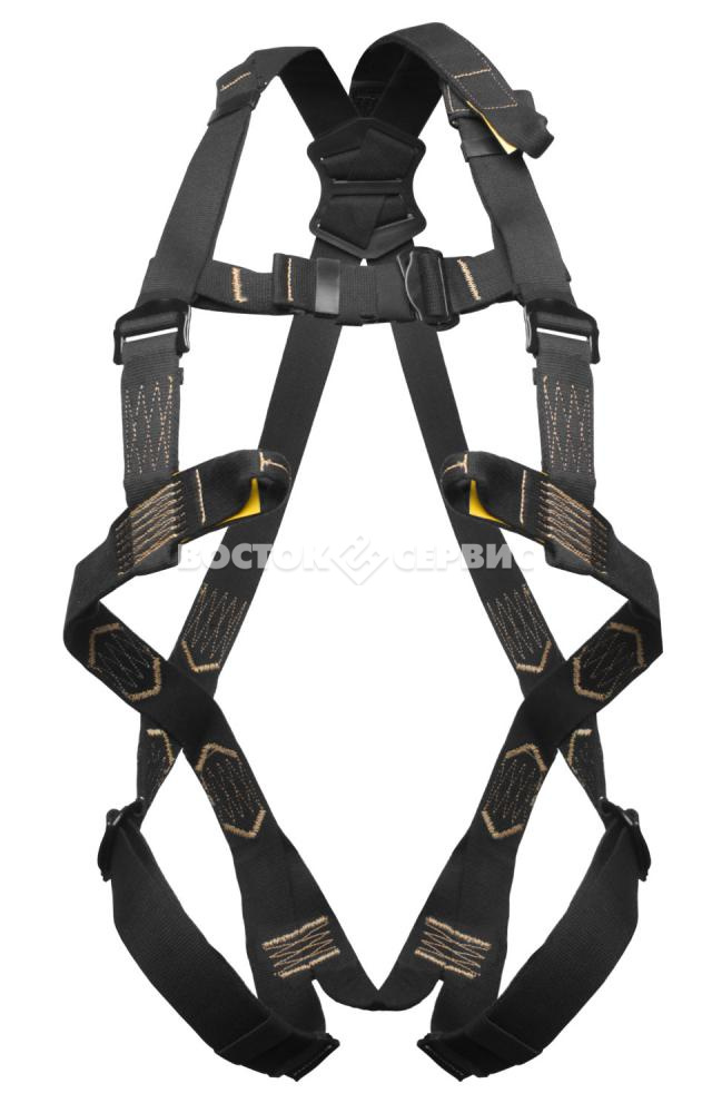 Количество точек крепления: 2 (на спине и груди). Дополнительная точка крепления на спине в виде в виде хлястика для более удобной самостоятельной фиксации карабина страховочного стропа к анкерной точке.