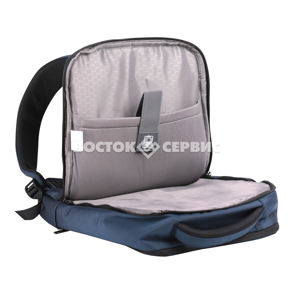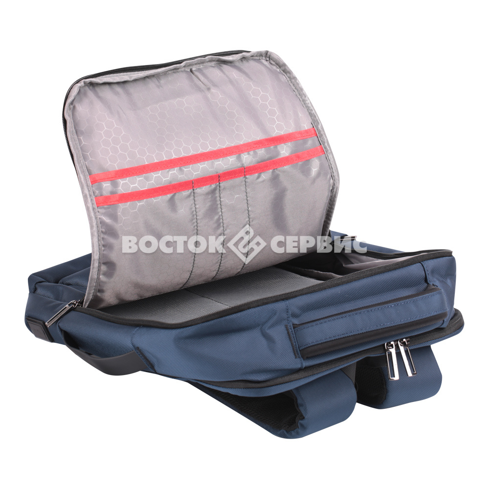 Карманы и отсеки: 3 наружных на молнии, 1 боковой для воды или зонта, большой отсек с сетчатыми карманами для аксессуаров и канцелярии, большой отсек для ноутбукаи документов.