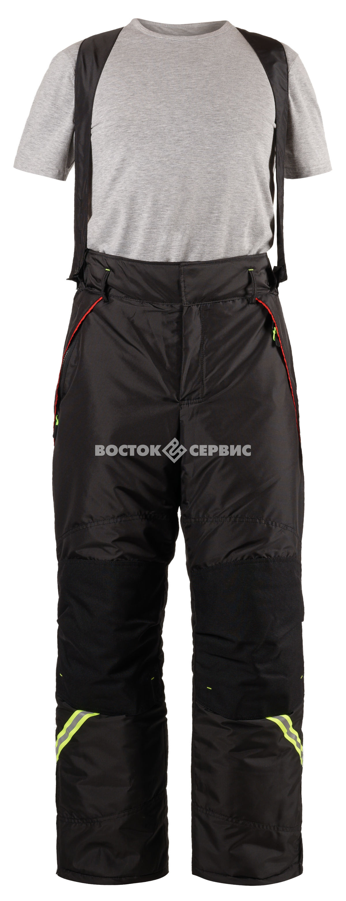 Защитные элементы: наколенники-карманы для амортизационных вкладышей, усилительные накладки на задних половинках и по низу брюк, внутренние снегозащитные юбки