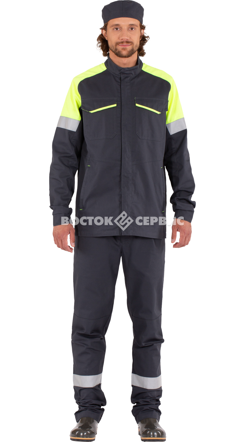 Карманы: на верхней части левой полочки накладной карман, двухсекционный с клапаном с текстильной застёжкой, на верхней части правой полочки накладной карман с клапаном с текстильной застёжкой. Боковые нижние карманы с застежкой на тесьму "молния" в куртке. Передние половинки брюк с карманами с отрезным бочком, на правой задней половинке, накладной карман с клапаном.