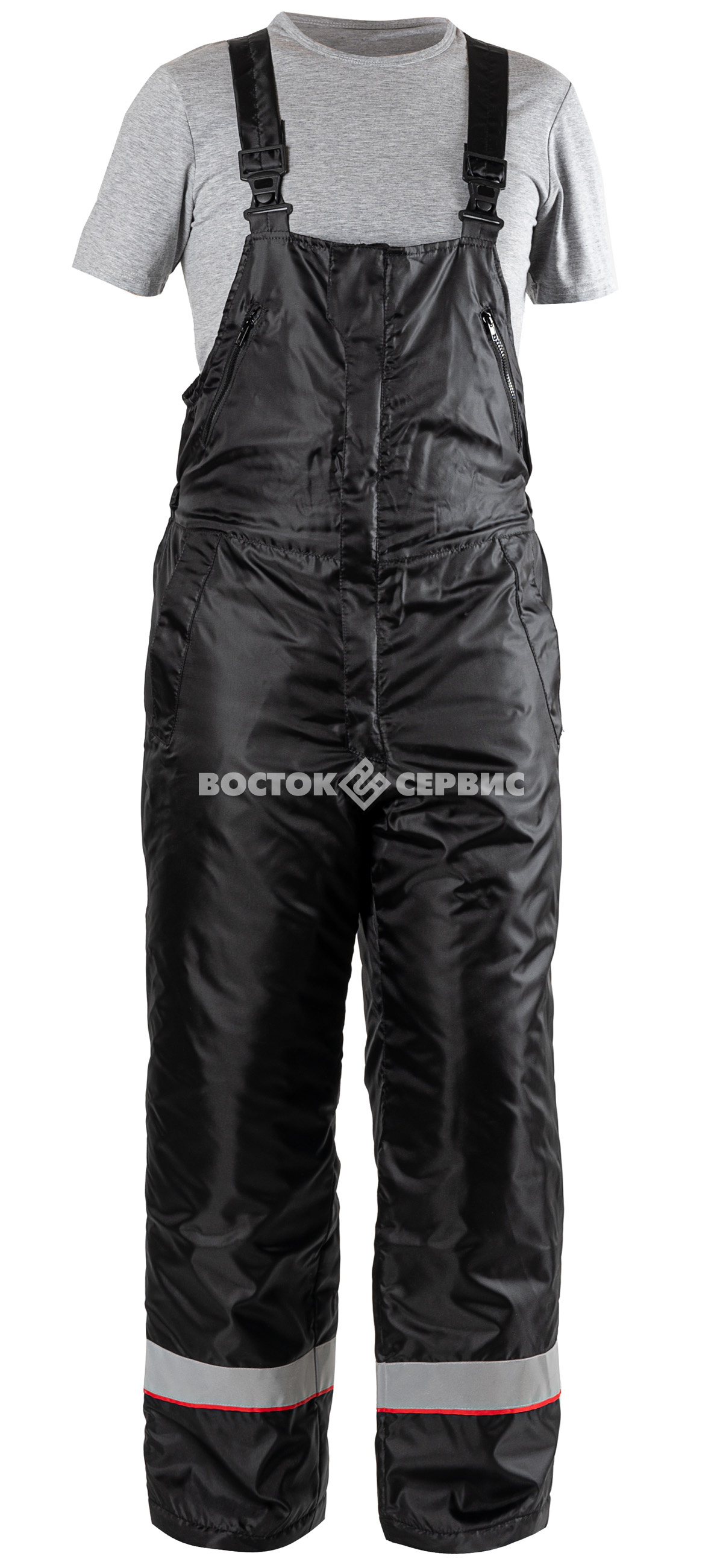 Карманы: верхние на молнии, нижние на молнии с клапанами; полукомбинезон - нагрудный прорезной на молнии.