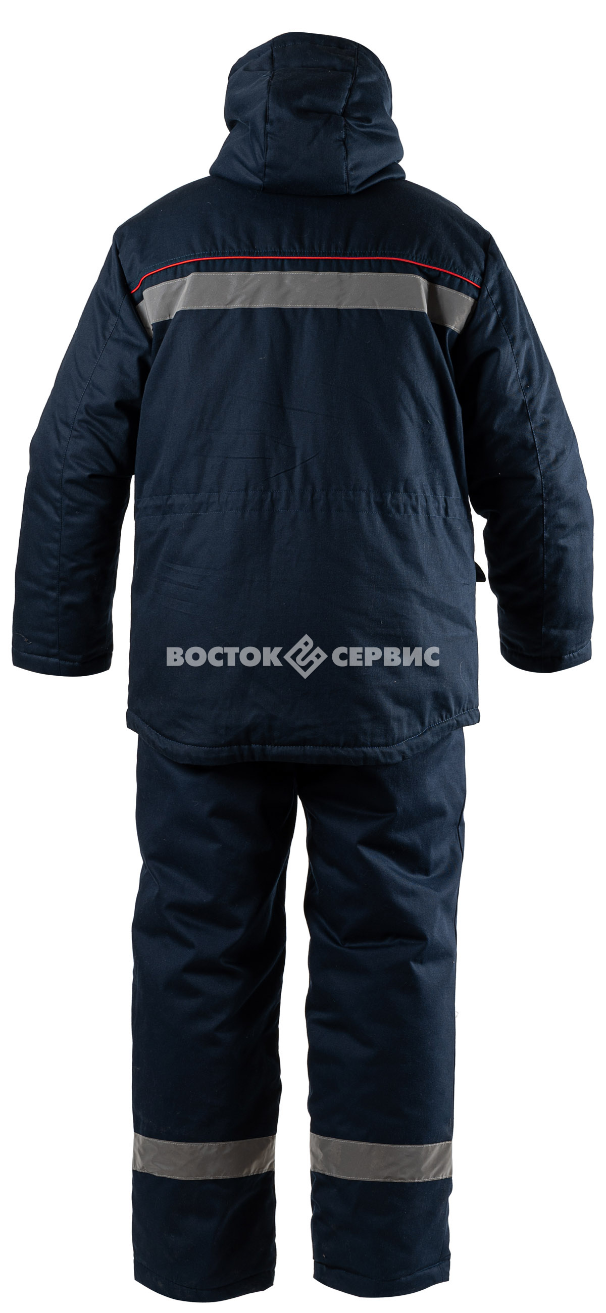 Защитные элементы: высокий стеганый пояс брюк, удлиненная спинка куртки.