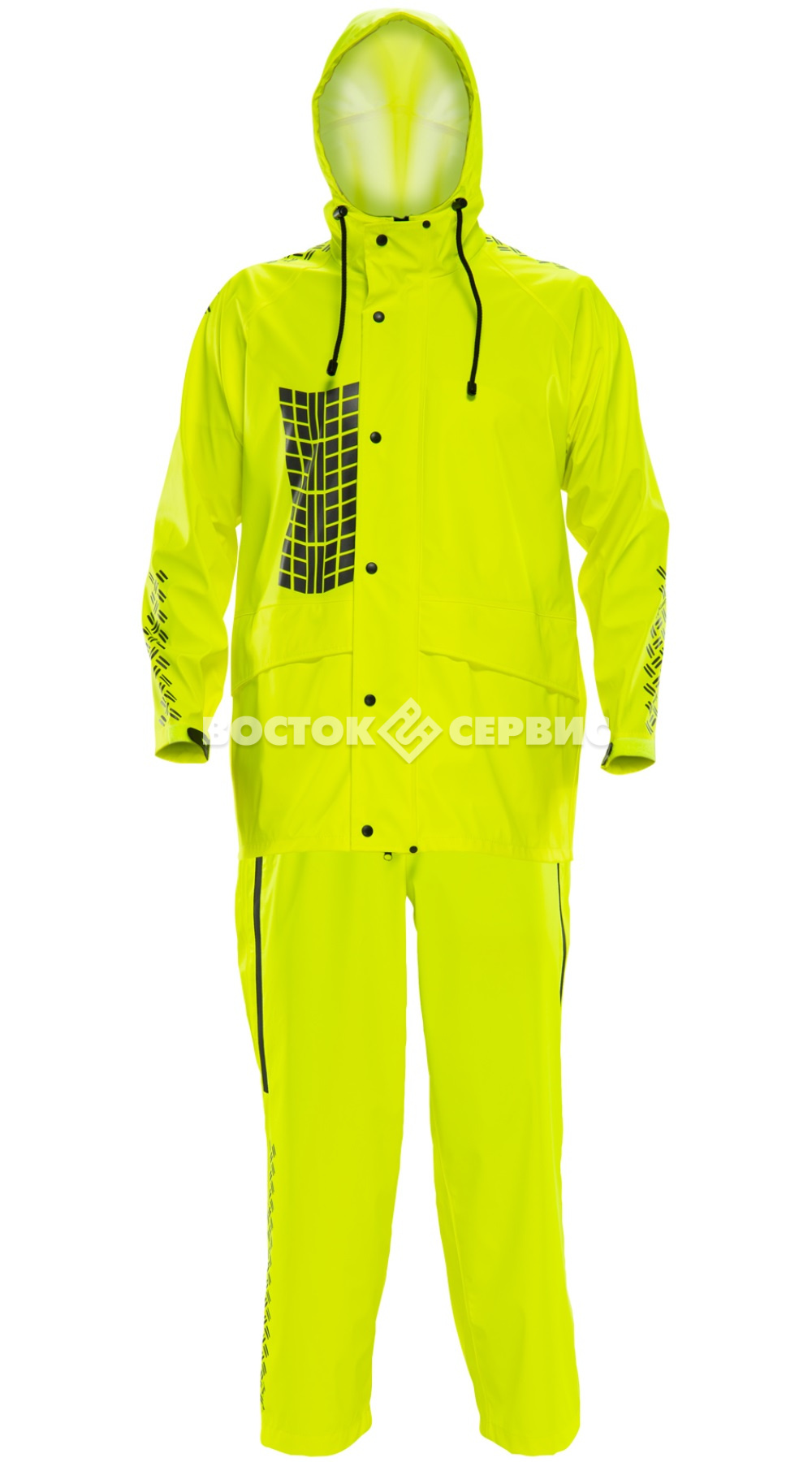 Карманы: в куртке нижние, закрытые клапаном, на брюках по боковым швам влагостойкие молнии для удобства пользования карманами брюки под костюмом.