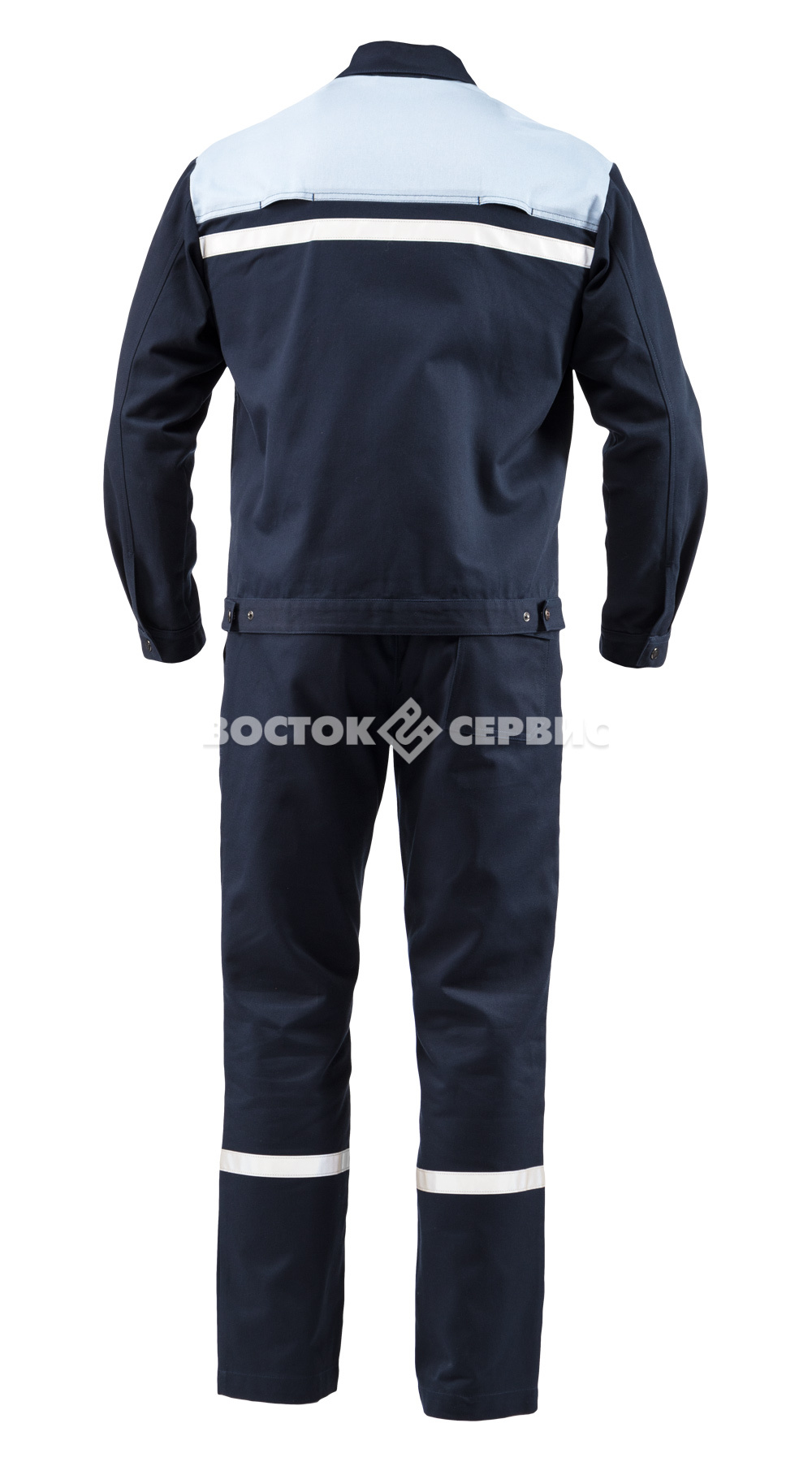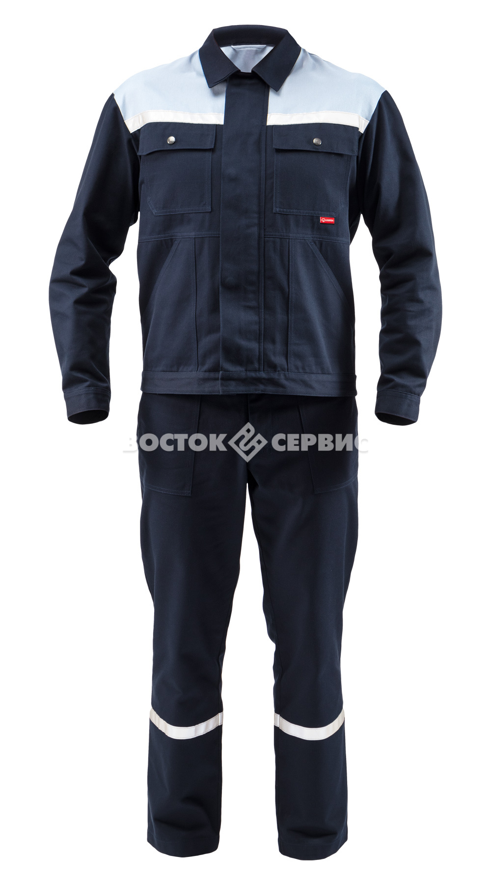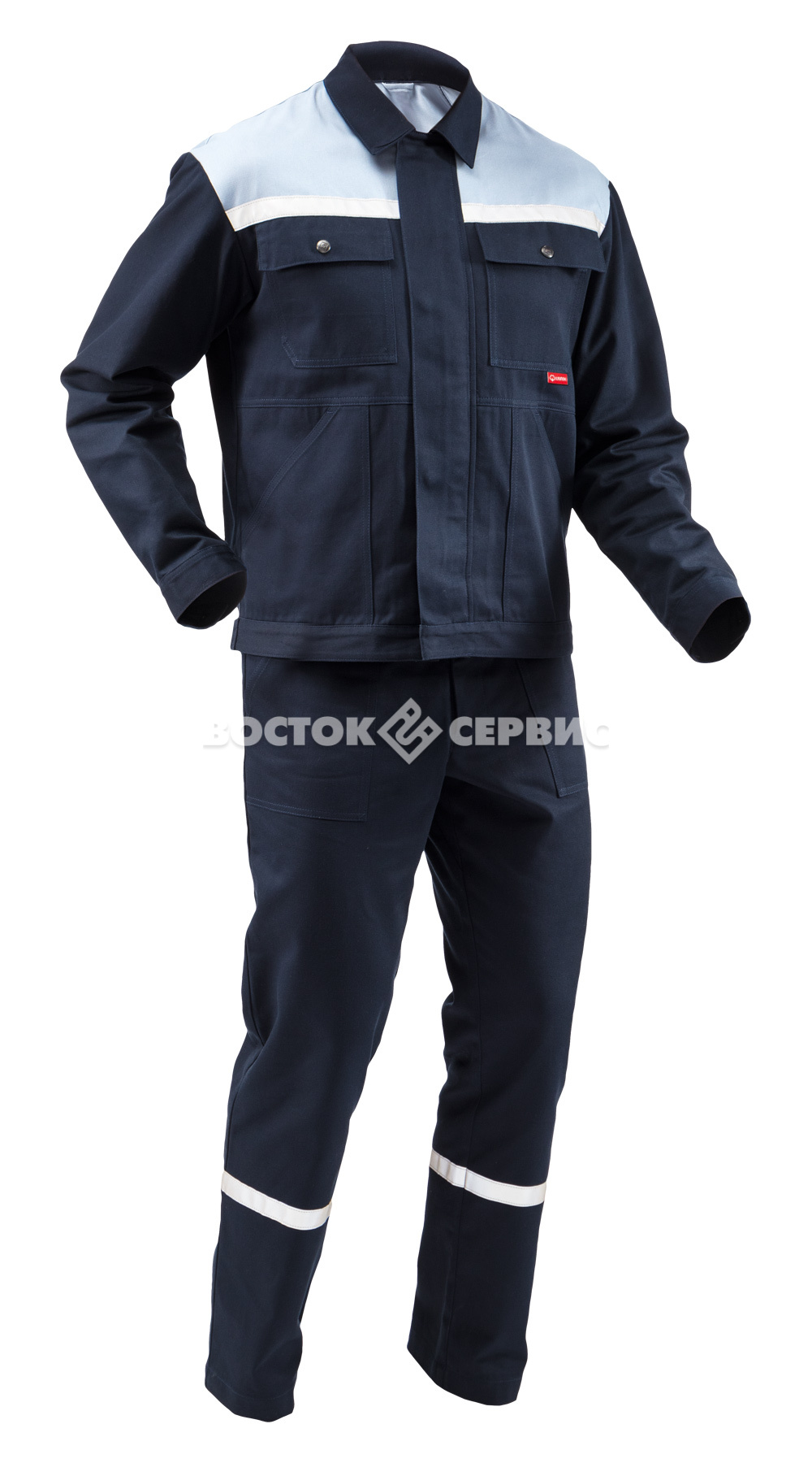 Карманы: нагрудные с клапанами на кнопках, боковые с наклонным входом на куртке; боковые с наклонным входом, задний на брюках.