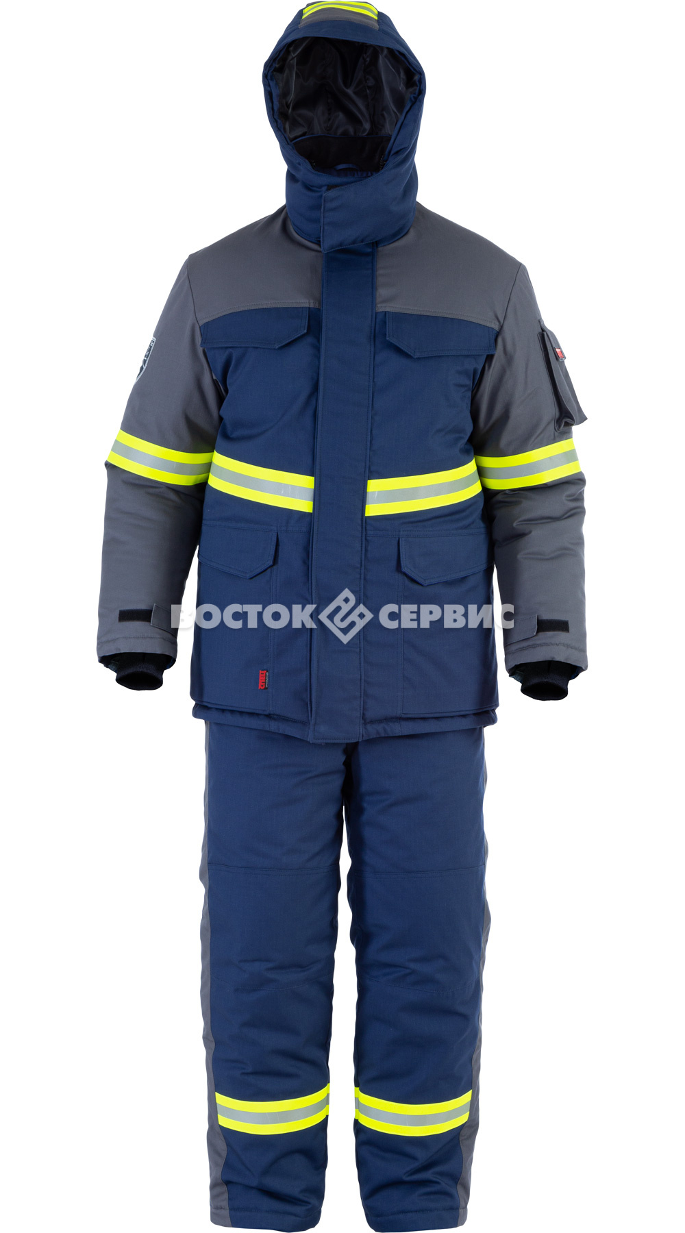 Регулировки по ширине: по низу рукавов, куртки, поясу полукомбинезона Карманы: нагрудные с прямым входом, нижние накладные объемные, на рукаве, внутренние на молнии и накладной объемный; боковые наклонные на полукомбинезоне.