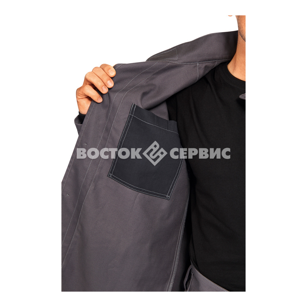 Карманы: в рельефных швах на молнии, накладной с клапаном на левой полочке, внутренние накладные, в брюках - боковые, карман для ин струментов в накладке, карманы для амортизационных вкладышей.
