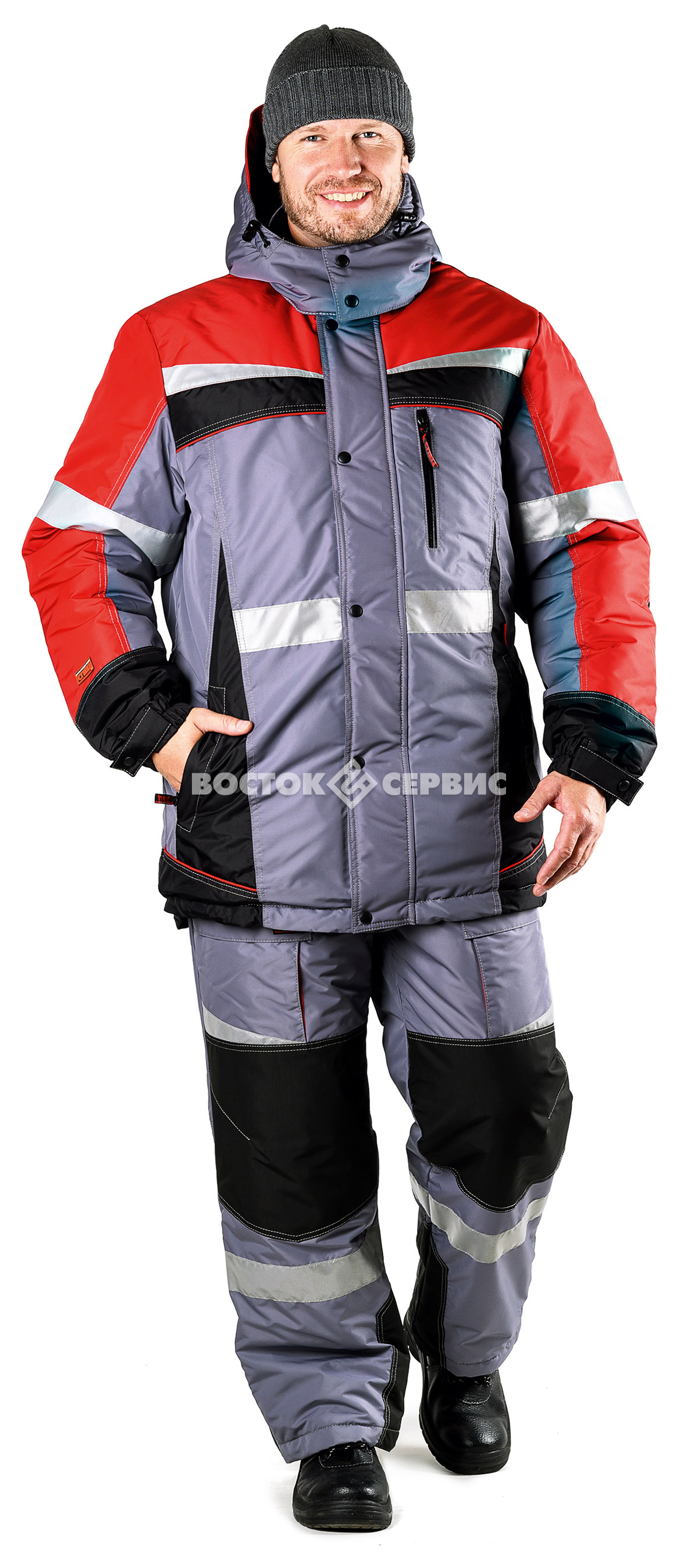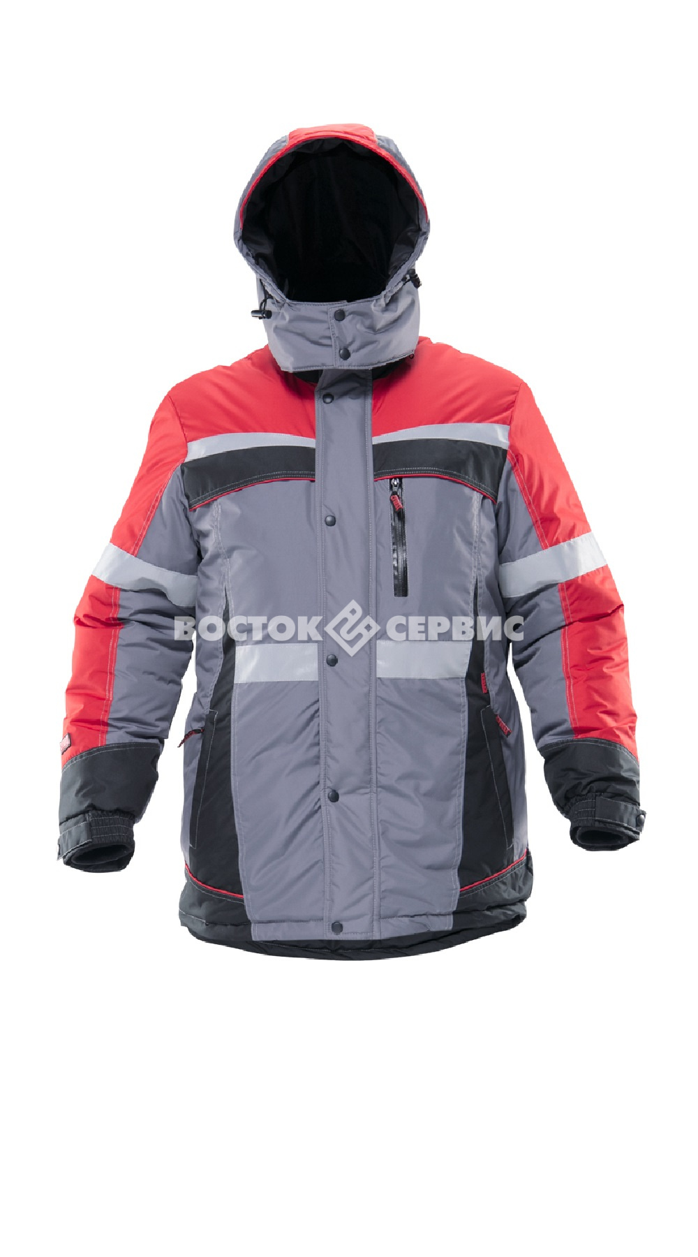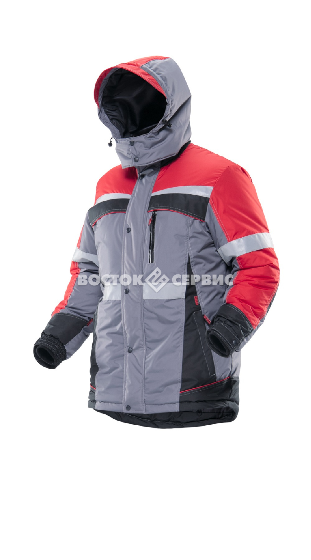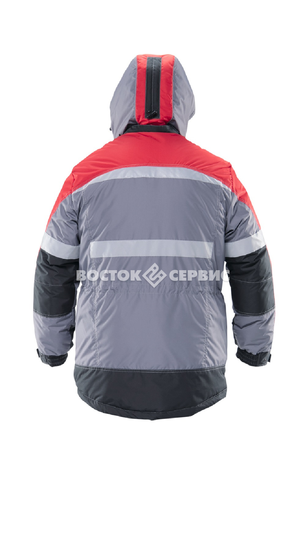Регулировки по ширине: по линии талии, низу изделия и рукавов Световозвращающие элементы: по полочкам, спинке и рукавам, на капюшоне Цвет: серый с красным и черным