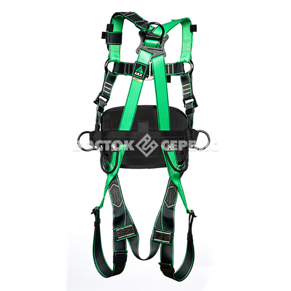 5-точечная регулировка размера. Длина наплечных лямок изменяется одни м движением . Усовершенствованая конструкция пряжек ускоряет регулировку привязи под размер пользователя. На поясе предусмотрены специальные петли для крепления инструмента и карабинов соединительно-амортизирующей подсистемы (до 7 кг). Вращающийся пояс обеспечивает возможность поворота туловища при работе.